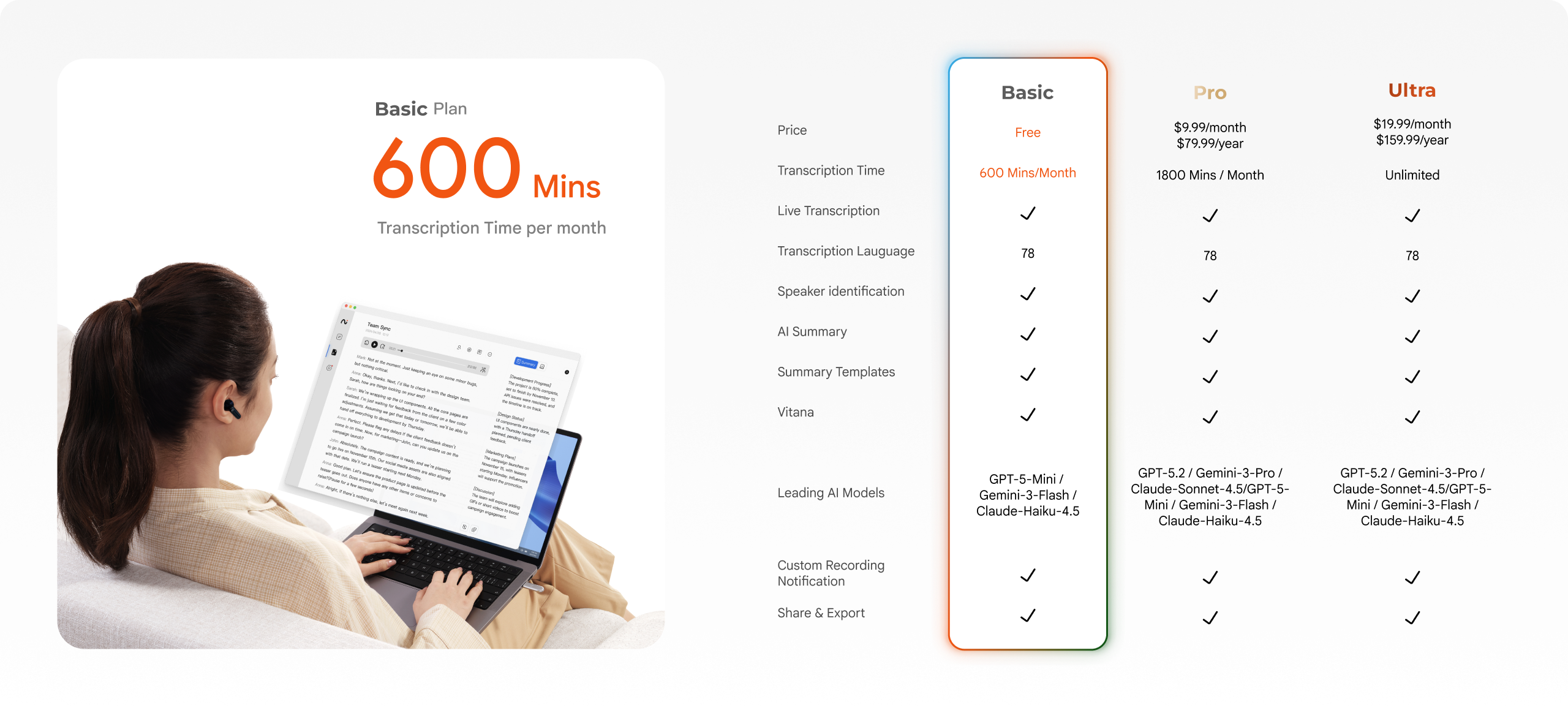 Your recordings and transcripts are securely stored under your account and synced across devices.